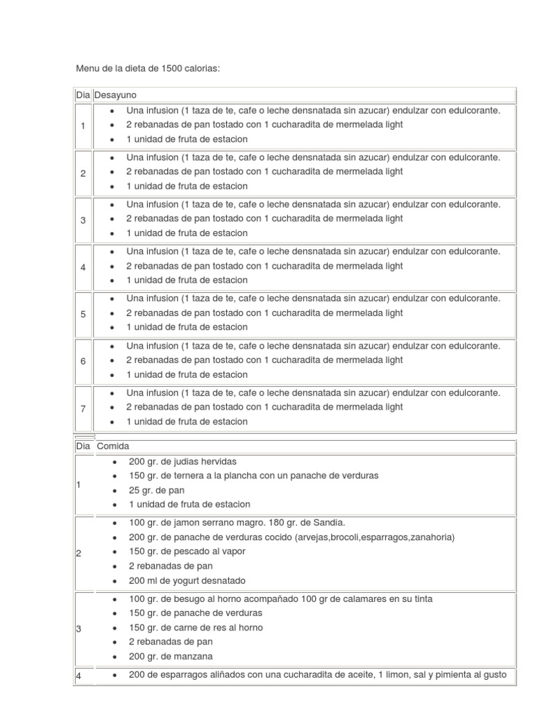 Con la dieta 1500 calorías vas a llevar una alimentación saludable y equilibrada para tu cuerpo sin echar mucho de menos otros alimentos como hacen la mayoría de las dietas. Caso esqueça não beba a água de uma só vez. Plan semanal de alimentación Menú de 1500 calorías Plan semanal - 1500 calorías Desayuno Comida Merienda Cena Recena Lunes LECHE 200 CC PAN 40 G ACEITE MEDIA MAÑANA FRUTA 1 PIEZA LENTEJAS 100 G FILETE TERNERA ENSALADA FRUTA 1 PIEZA 1 YOGUR DESNATADO VERDURA 200 G TORTILLA FRANCESA ARROZ 80 G FRUTA 1 PIEZA 12 VASO DE LECHE.