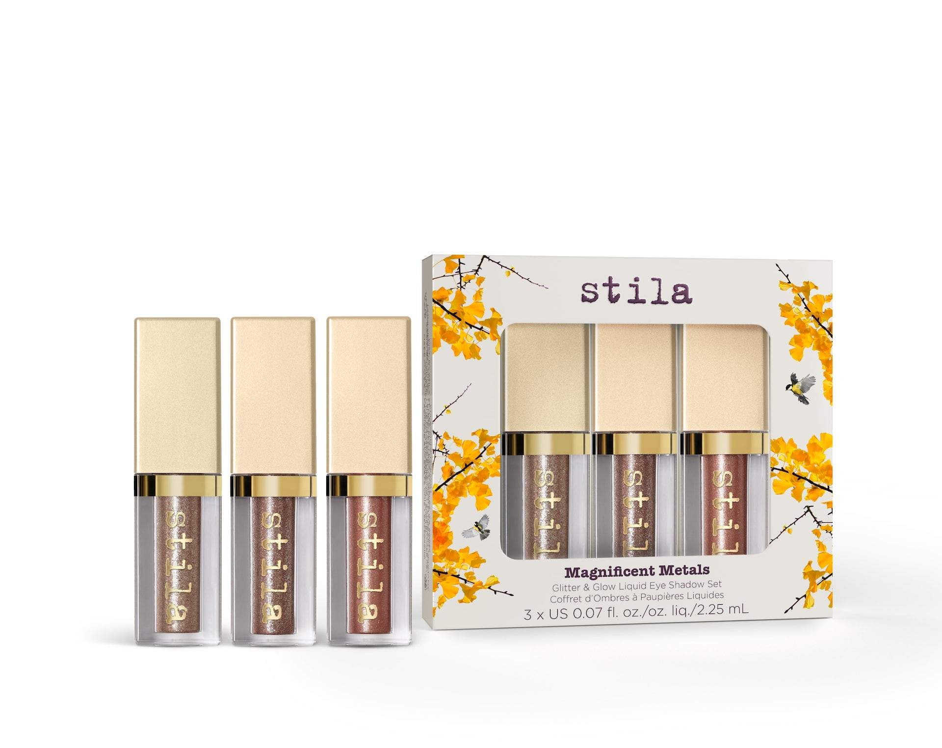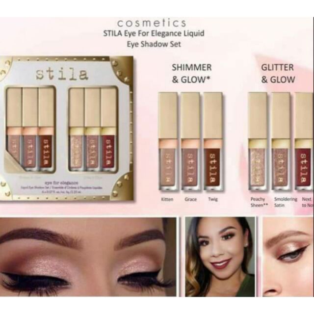 Add starry-eyed sparkle to any look with this mini-size trio of stilas long-wearing lustrous eye shadows. Shimmer Glow Liquid Eye Shadow in Starlight Kitten Grace Cloud Jezebel Twig. Stila Starry-Eyed Liquid Eye Shadow Vault for Holiday 2017.